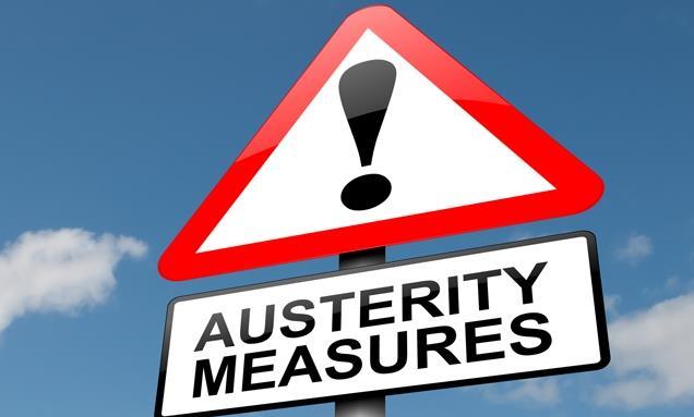 Illustration depicting a road traffic sign with an austerity concept. Blue sky background.