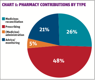 Categories for data collection included the location of pharmacy staff, the patient’s stage of care, and an outcome measure in terms of whether the contribution was accepted or rejected by the clinician. Contributions were attributed to one of four main types: medicines reconciliation, prescribing, (medicine) administration, or advice/monitoring.