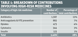 Contributions that specifically support compliance with “high-risk” medicines, national targets, CQUINs, patient safety alerts and National Patient Safety Agency guidance were categorised separately. Of the total, 3,409 (28 per cent) of contributions were made in this area (see table 1).