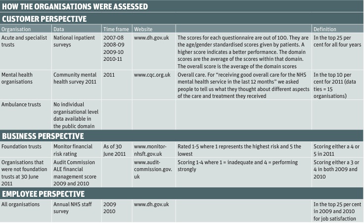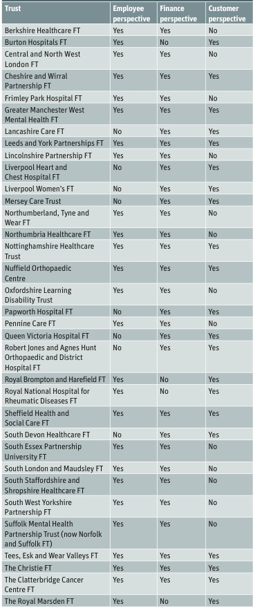 Because commissioning is in a state of flux, we included only provider organisations: specialist trusts, acute trusts and mental health trusts. We used the same three perspectives as last time: customer, business and employee.