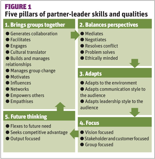 We may all be familiar with models that enable us to reflect on our skills as a manager and leader. However, these may not extend to specific consideration for when we are increasingly finding ourselves leading across organisational and cultural boundaries. Exploration surrounding the concept of the partner leader as an individual has enabled the development of five interconnected pillars relevant to their success at different stages of partnership development.