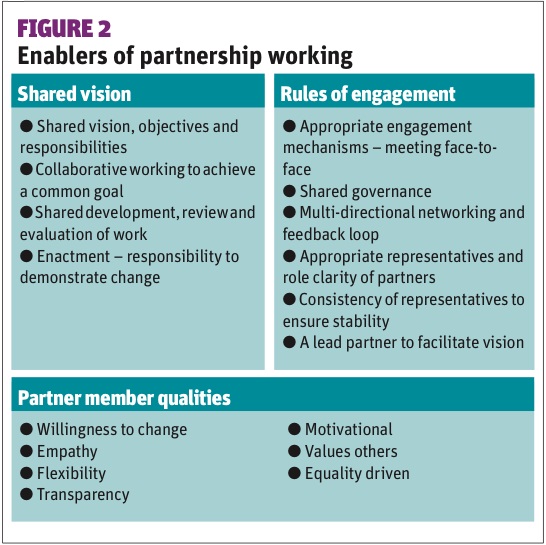 A final consideration is that for partnership-work to be effective, leaders need to consider a mapped and proactively managed model of engagement. One case study saw a strategic group demonstrating the previously identified partnership enabler principles which then moved forward to develop its own effective model of engagement.