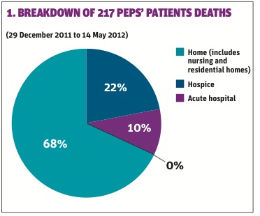 In the first five months of operation, PEPS has co-ordinated the care of 415 patients, 68 per cent of whom died at home, as they wanted. Only 10 per cent died in hospital.