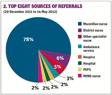 Figure 2 illustrates the top eight sources of referrals from professionals which result on data being included on the information system for PEPS, and is representative of the strong links established with the Macmillan team (78 per cent). Referrals from other sources, particularly district nurses, are increasing monthly as more work is done to raise awareness of the co-ordination centre.