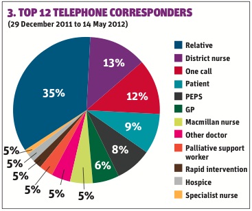 Figure 3 shows telephone activity illustrating the top 12 telephone corresponders. Aimed at supporting patients and families with a single number to contact, it is not surprising that the largest percentage (35 per cent) refers to patients’ relatives.